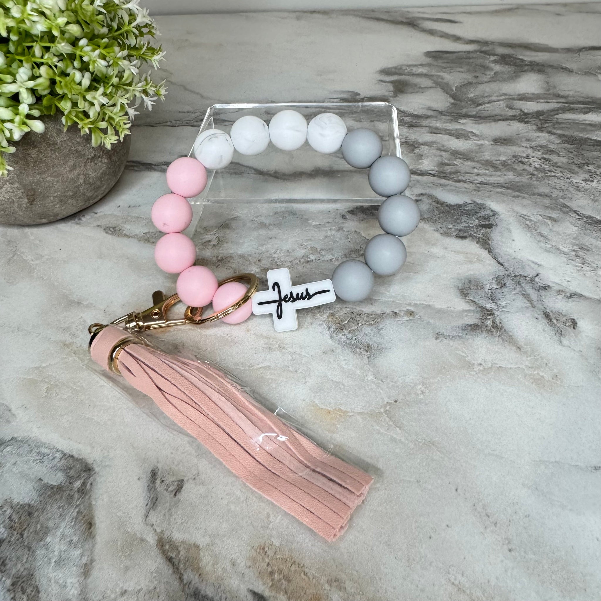 Silicone Bracelet Keychain - Religious, Jesus, White & Pink