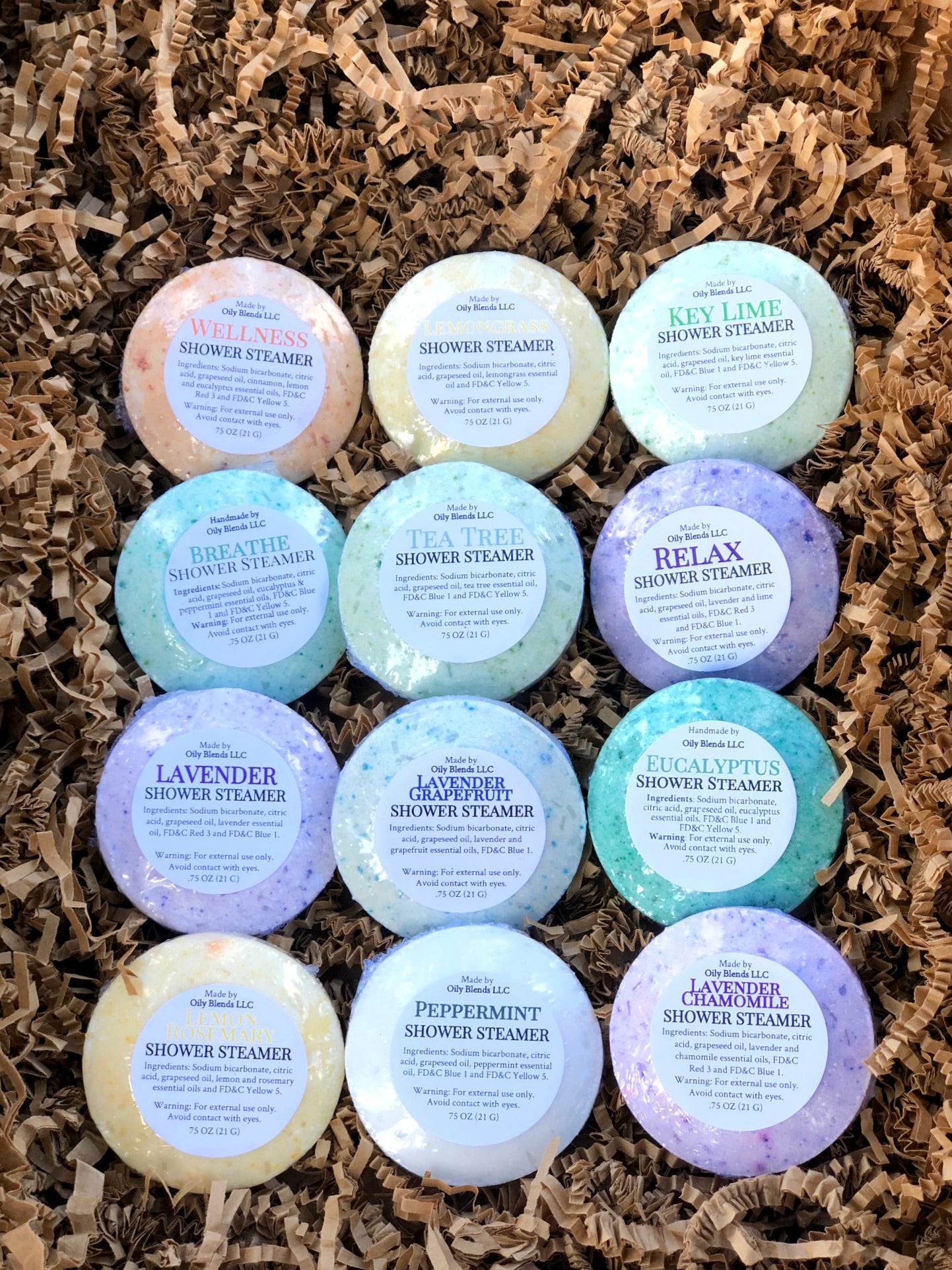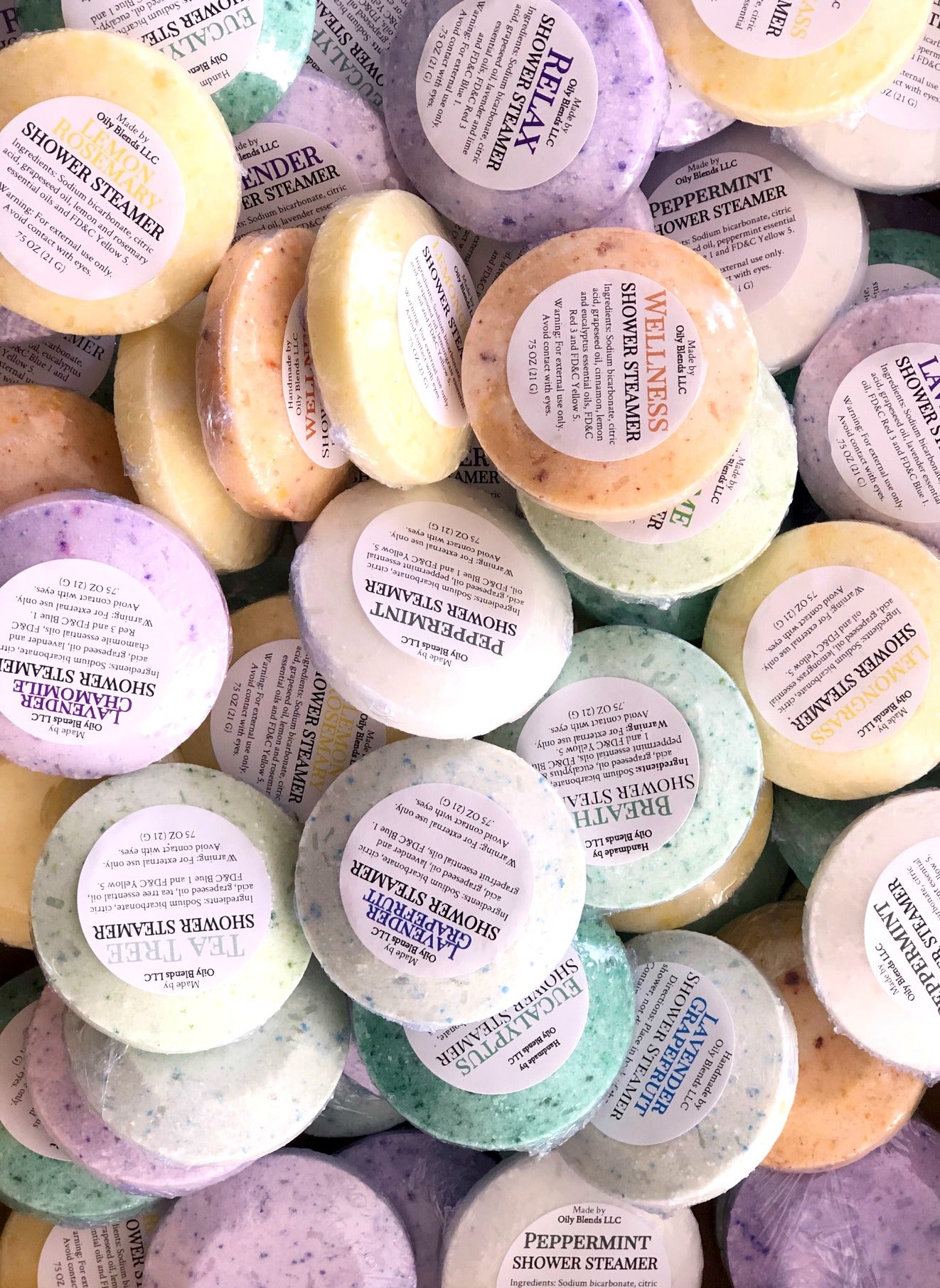 Shower steamers offer a blissful bath bomb experience—without the bath. Perfect for those who prefer showers, each steamer is individually shrink-wrapped and labeled on the bottom with clear directions and a full ingredient list.